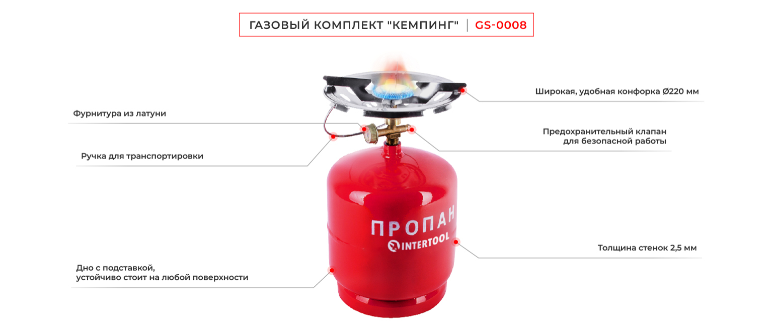 Балон має широке дно із підставкою, тому він стійко стоїть навіть на нерівній землі. Ручка, розміщена на пальнику для зручнішого перенесення всього комплекту.